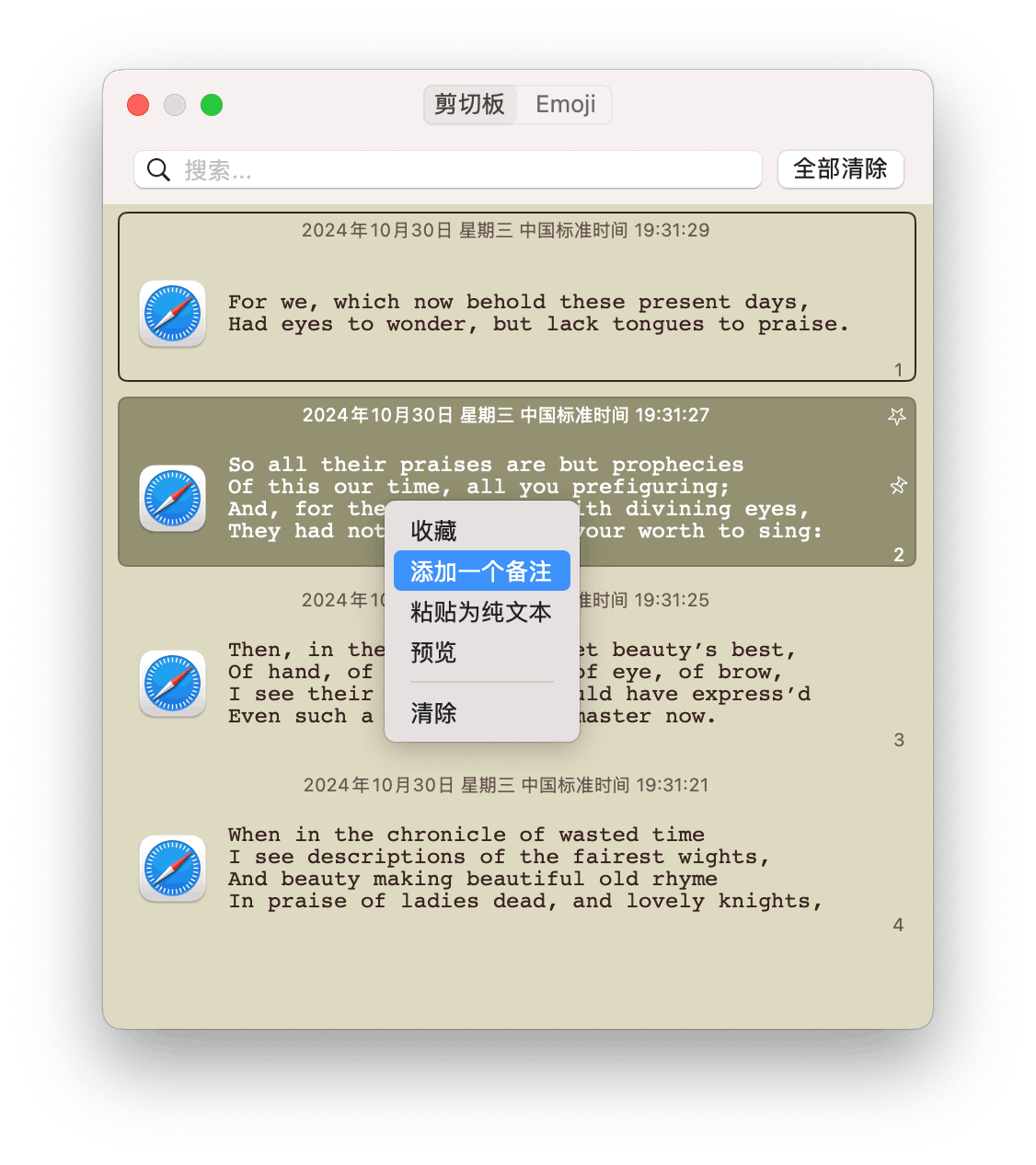 选择收藏,该剪切项将会固定,并且无法被清除。当鼠标悬浮到每个剪切板项目上时,您也可以通过点击右上角的☆符号来收藏该项目。