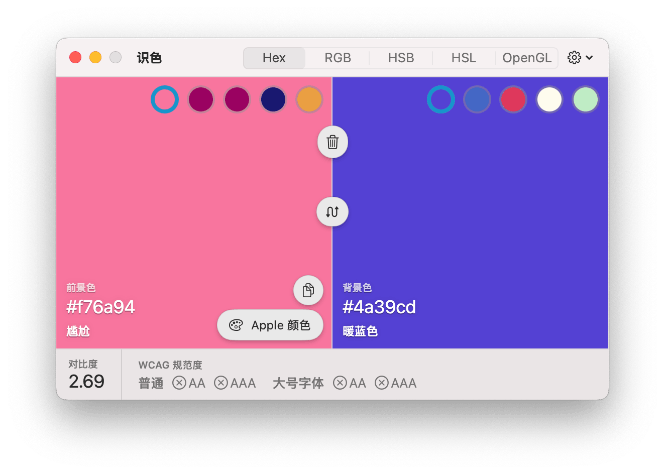 识色窗口底部会显示您选择的前景色和背景色的对比度满足情况——当对比度不满足要求时,在普通或者大号字体中将会有灰色x出现: